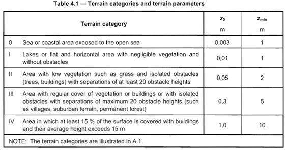Roughness Length (Zo) and the Minimum Height (Zmin) are provided for each Terrain Category in Table 4.1 of EN 1991-1-4 (2010).