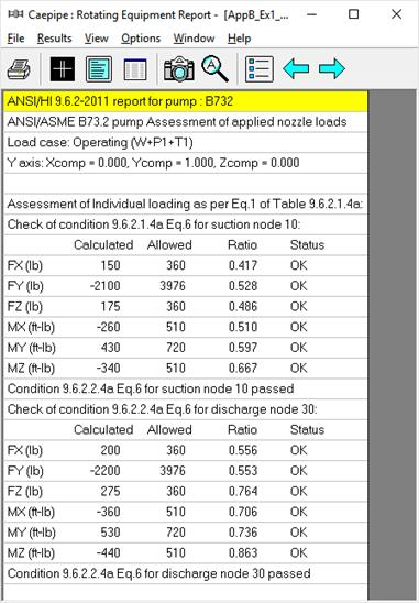 In addition to the input details, for a specific load case, the calculated forces and moments, ANSI/HI 9.6.2 allowable, ratios (of calculated to allowable) and status for all of them are reported.