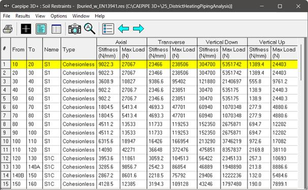 Save and analyze the model through File > Analyze. Upon analysis, under Results, CAEPIPE displays an option “Soil Restraints” in addition to other analysis results.