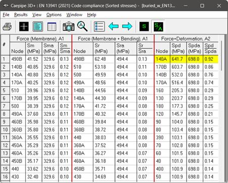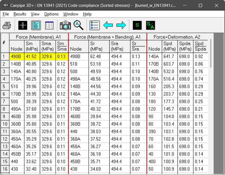 The stresses computed by CAEPIPE as per EN13941-1 (2019) are sorted in the descending order of stress ratios. This can be seen through CAEPIPE Results window > Results > Results… > Sorted stresses.