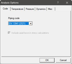 This analysis code can be selected through CAEPIPE Layout Window > Options > Analysis > Code > EN13941 (2019) as shown below.