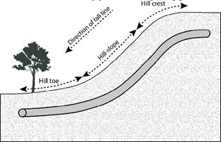 When the option “Value entered is Depth of Soil above pipe centerline” is turned ON in Soil input, then CAEPIPE will compute maximum soil loads for the sections buried using the Depth entered. This option will be helpful for modeling pipes that are running up or down a hill with same depth of soil filled above pipe’s centerline as shown in the figure given below.