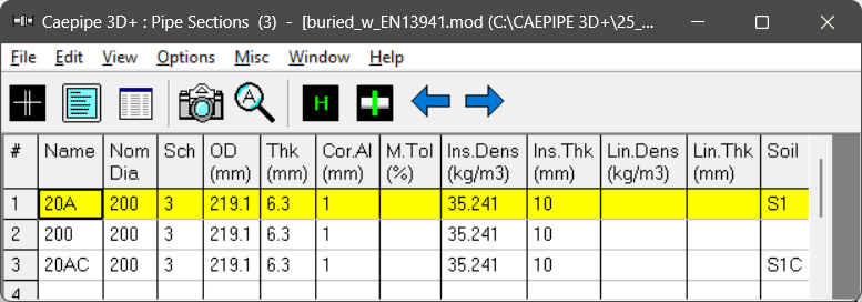 So, in the piping system used for this tutorial, two pipe sections named 20A and 20AC are defined for buried pipes without and with expansion cushion respectively. A pipe section named 200 is defined to represent above ground piping model. All three pipe sections have insulation as shown below.