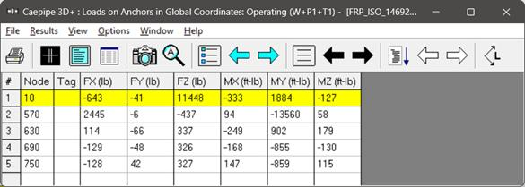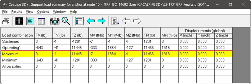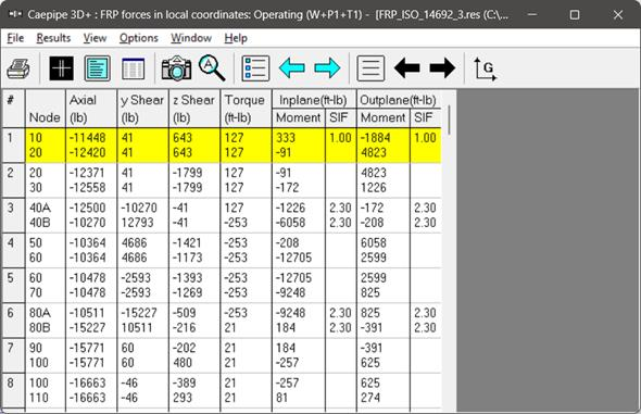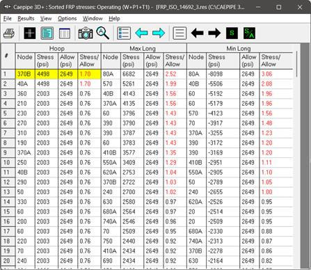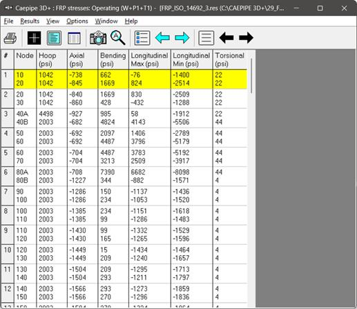 FRP stresses results of CAEPIPE display the stresses computed as per ISO 14692-3 on an element-by-element basis as shown below.