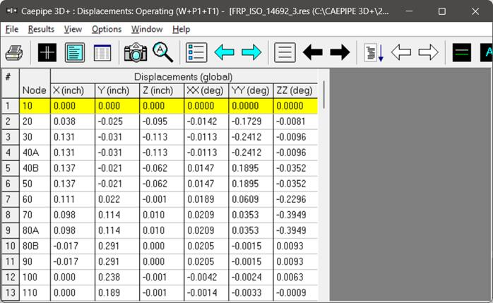 CAEPIPE will show the deflections and support loads for each load case under Deflections and Support loads results as shown below.