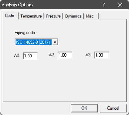 Select the piping code for analysis as “ISO 14692-3” through Layout Window > Options > Analysis > Code as shown below and press the button “OK”.