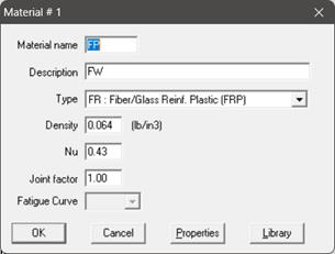 The material name can be up to five alpha-numeric characters. Enter description, density and Poisson’s ratio. You need to select “FR: Fiber Reinf. Plastic (FRP)” from the Type drop-down combo box before you click on the Properties button.