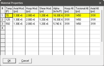 Click on the Properties button, you are shown the table below where you can enter temperature-dependent properties. Additionally, you can also define the Hoop, Torsional and Axial allowable stresses so that CAEPIPE can use them for code compliance checks as per ISO 14692-3 and display them under "Sorted FRP Stresses” results.