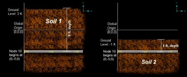 In the figure below, the height of the soil surface for Soil 1 is 3 feet from the global origin. Pipe node 10 [model origin] is defined at (0,-5, 0). So, at Node 10, the pipe is buried 8’ [= (3’ – (-5’)] deep into the soil. Define similarly for the other soil.