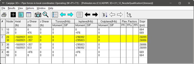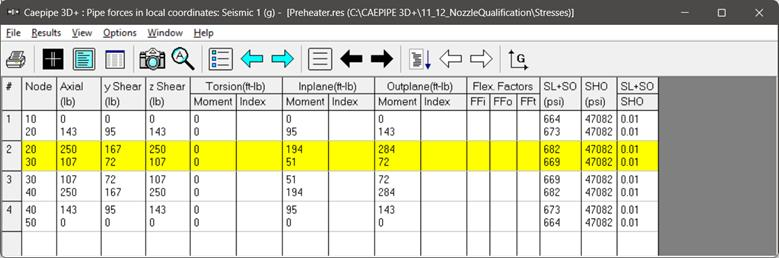 Save the CAEPIPE model and perform the analysis through Layout window > File > Analyze. CAEPIPE will include in the pipe stress analysis the local shell stiffnesses internally computed. These local shell stiffnesses can be seen in CAEPIPE through Layout window > View > List > Nozzle stiffnesses.