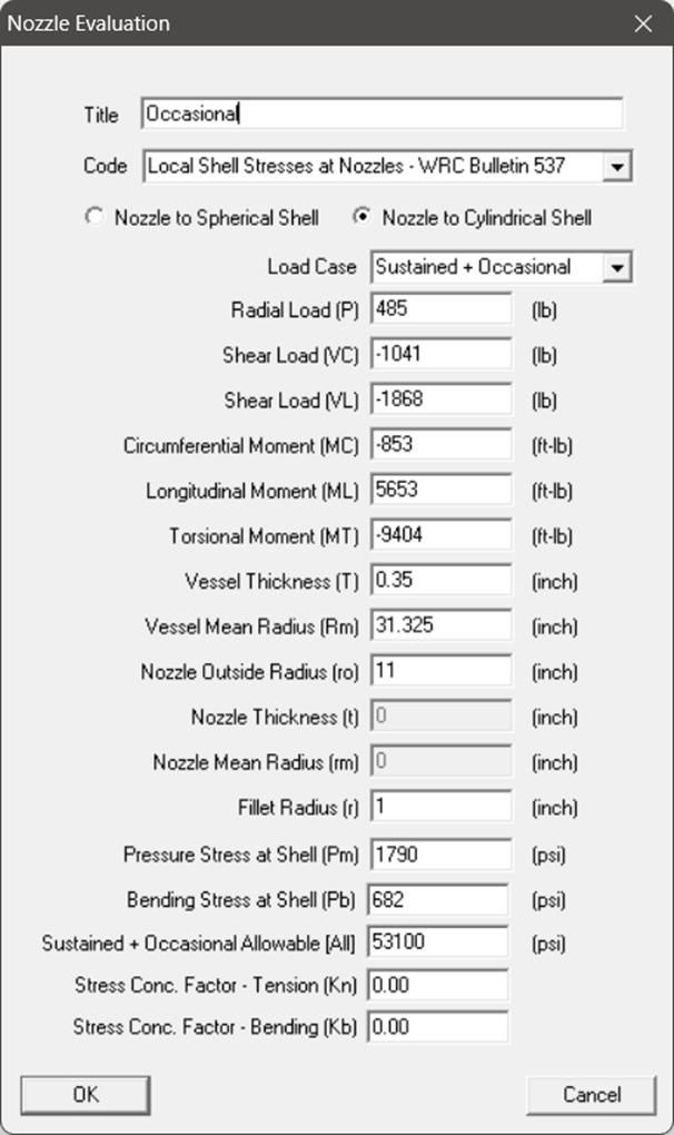 Using the above data as well as the Vessel and Nozzle Parameters, create three (3) Nozzle Evaluation files corresponding to Sustained, Sustained + Occasional and Operating load cases.