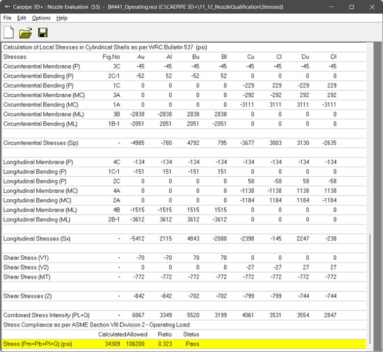 As stated in the Section titled “Nozzle Evaluation” of CAEPIPE Technical Reference Manual, Pressure Stress at Shell (Pm) and Bending Stress at Shell (Pb) need to be manually calculated or determined using computer programs and input in the “Nozzle Evaluation” Module.