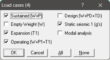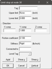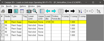 The support loads for the Operating (W+P+T) load case in Local Coordinate System for all the Limit Stops are shown below. It can be observed that for the Operating load case, the Lower Limit is shown as “Reached” only for the Limit Stop at Node 30. This means that the tall vertical pipe riser is lifting up at all other Limit Stops due to thermal expansion. In other words, all Limit Stops other than that at Node 30 are not carrying any weight during operation.