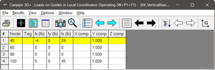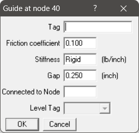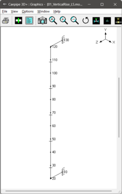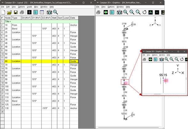 Lateral supports can be added along the vertical riser to restrict horizontal movement under Occasional load cases (e.g., seismic loads) while still permitting free vertical thermal expansion. This is achieved by inserting Guides with clearance gaps at alternate nodes (Nodes 40, 60, 80, and 100), as illustrated below.