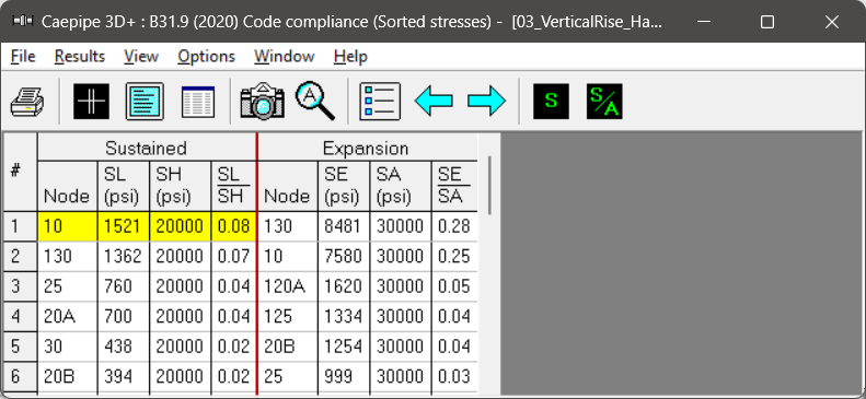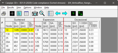 Save the model (File > Save) with a different name (say, 02_VerticalRise_Hangers.mod) and run the analysis (File > Analyze). From the sorted stresses results, it is observed that the stress ratios for both Sustained and Expansion load cases are well below 1.0, thereby meeting the Code Compliance as per ASME B31.9 (2020).
