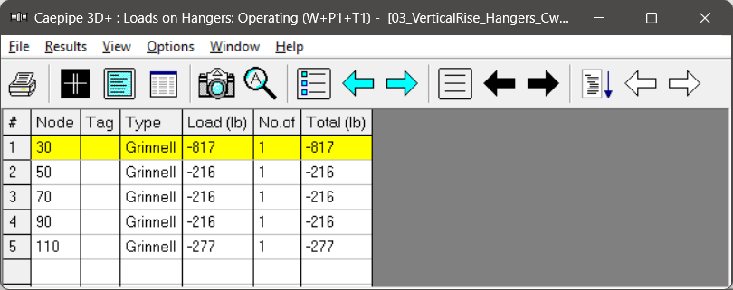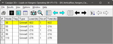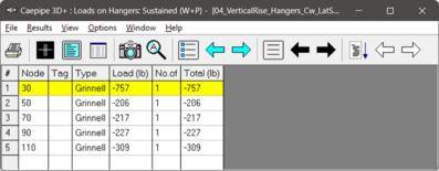 The Hanger loads for Operating load case shows non-zero load values at all hangers, thereby confirming that the weight of the tall vertical pipe riser along with its content weight are carried by all hangers without interfering with the thermal expansion of the piping.