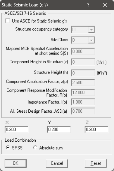 Turn on Static Seismic load case through Loads > Static Seismic 1… , and input the details.