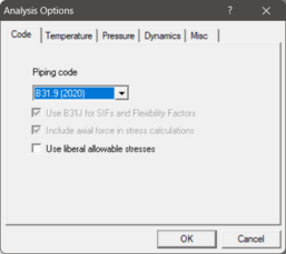 The analysis code is selected as ASME B31.9 (2020) via Options > Analysis > Code.